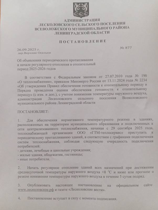 Наименование: | ПОСТАНОВЛЕНИЕ от 26.09.2025 г. № 877 Об объявлении периодического протапливания и начале регулярного отопления в отопительный период 2025—2026 годов |